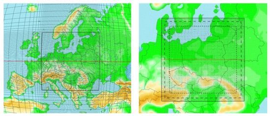 GEM computational grid: global model (left) with variable resolution (0.135° over Europe) and nested grid over Poland (right) with a resolution of 0.0625° [19].