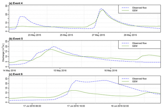 The level of agreement between modeled and observed flow validation results are very similar to the model calibration phase. Good results have been obtained for Event 4, acceptable for Event 5, and unsatisfactory for Event 6. An interesting observation occurs in Event 4. The first peak is not mapped at all, whereas the second is simulated almost perfectly. This shows that GEM data perform worse in mapping precipitation for small values, which are then transformed through surface-runoff into small flood events.