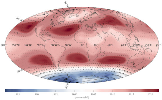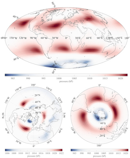 The pattern in the Northern Hemisphere is similar to that in the Southern Hemisphere, with two features extending over the northern Pacific and Atlantic oceans, similar to the southern structure, but with the third positive anomaly lying over the Asian continents (Central Asia and Tibet). This overall structure of global positive pressure features could be roughly described as the intersection of a series of three strong cylinders and one weaker cylinder, parallel to the Earth’s axis of rotation, with the Earth’s surface. South of 40°S latitude, the features turn negative and form the quasi-circular Antarctic oscillation (AAO), also known as the Southern Annular Mode (SAM), a belt of low pressures surrounding the frozen continent (e.g., [67,68]). A zonal average of Figure 1 is not really consistent with the classical latitudinal description of the Hadley, Ferrel and polar cells, with relatively moderate low pressures over the equatorial belt, high pressures around 30°N and lower values at higher latitudes, particularly over AntarcticaThe overall averaged zonal structure is not symmetrical with respect to the Equator [2].