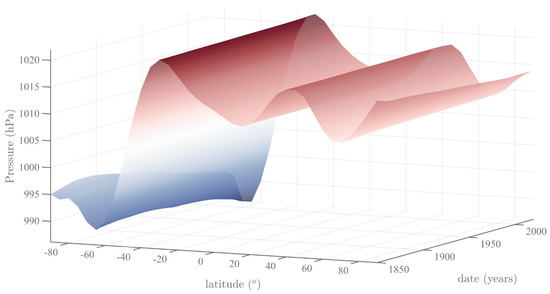 These are readily recognized as the Jose, Gleissberg, Hale and Schwabe cycles, the quasi-biennial oscillation and the annual cycle followed by its first three harmonics. Figure 3 represents the mean (from 1850 to 2020) of the SSA trends of SLP in Hammer–Aitoff and north and south stereographic polar projections. This mean is representative, since the observed (decreasing) overall variation in pressure is only 0.1% in the 170 years of the study. We illustrate the stability of the SLP trend both in space and time with Figure 4, which shows the variation in the trend of SLP since 1850 as a function of latitude. Indeed, the latitudinal structure of mean pressure (SSA trend) is remarkably stable over 170 years (a rather rare feature in geophysics and geodynamics, both internal and external to the solid Earth), with its typical asymmetry between the two hemispheres.
