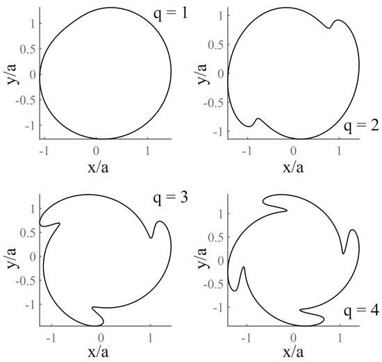 The solutions of systems (14a) and (14b) are displayed in Figure 5 for stationary flows with integers q = 1 to 4, with a = 0.5, b = 1, = 1 and = 0.1. Modes corresponding to parameter q evolve, and q is fixed by the nature and symmetry of the flow.