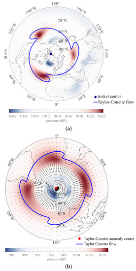 Figure 6a shows the superimposition of a pattern of Taylor–Couette flow with mode q = 3 and the SLP trend map of Figure 3 (lower left) for the Northern Hemisphere. We invert Equations (14a) and (14b) by simulated annealing [86] for = 1 (flow stationary and constant in time). The amplitude of the flow perturbation is on the order of 0.100 ± 0.002, and the triskeles pattern is centered on 91.3 ± 0.1°W, −77.1 ± 0.2°N. The fit is excellent and compatible with the shearing due to the direction of winds (east to west) at mid latitudes, opposite to the direction of Earth’s rotation from west to east.