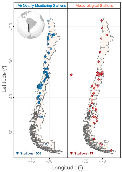 Location of air quality monitoring stations and meteorological stations included in the ChileAirQuality.