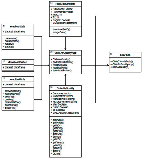 Figure 2 depicts the architecture of the AtmChile package by a Unified Modeling Language (UML) class diagram. It describes the input parameters for the different functions and the complementary methods used to support the central functions that make up the package.
