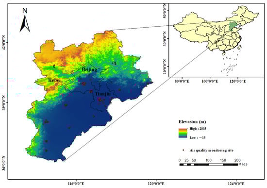 As shown in Figure 1, the research area of Jing-Jin-Ji region is located in the North China Plain and bordered by the Bohai Sea. The topography of Jing-Jin-Ji region is high in the northwest and low in the southeast. The region belongs to temperate monsoon climate. Summer is hot and humid, and winter is cold and dry. Rainfall is concentrated in the summer. The Jing-Jin-Ji region has an area of approximately 21,800 km2, which contains 13 major cities including Beijing, Tianjin, Shijiazhuang, Tangshan, Qinhuangdao, Handan, Baoding, Zhangjiakou, Chengde, Langfang, Cangzhou, Hengshui and Xingtai. Eleven cities expect Beijing and Tianjin belong to Hebei Province. As one of the world’s fastest-developing economic zones, Jing-Jin-Ji region is mainly engaged in heavy industry and manufacturing. Along with economic development, air pollution has increased mainly due to emissions from automobile exhausts and industry.