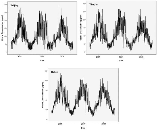 Figure 3 shows the variation trend of the daily maximum O3_8h concentrations in Beijing, Tianjin and Hebei province from 2018 to 2020. It can be seen that the annual distribution of ozone concentration presents a shape of a single peak. The ozone concentration reaches the maximum in summer, which is mainly due to the acceleration of photochemical reaction process by high temperature and intense solar radiation in summer [10]. A slight downward trend of ozone concentration was observed from 2018 to 2020 (the annual averaged ozone concentrations are shown in Table 1). This may be related to that the strict plan named “The 2017 work plan for air pollution prevention and control in Beijing, Tianjin, Hebei, and surrounding areas” issued by China in 2017 [31]. The areas were urged to promote the use of new energy sources and restructure industry structure, which reduced emissions of industrial pollutants and controlled NOx emissions.