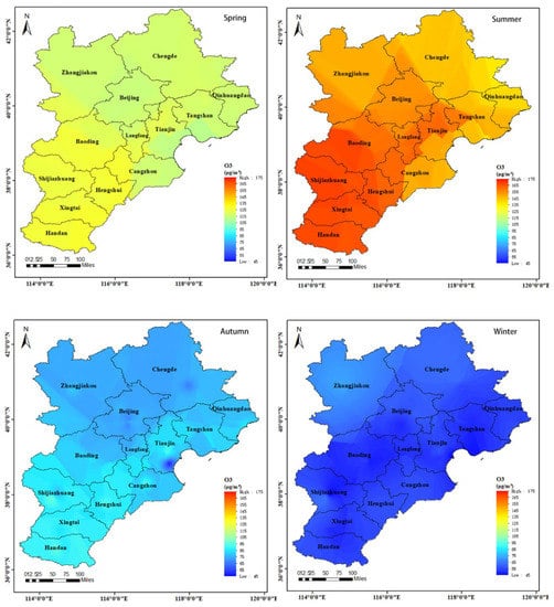 As shown in Figure 5 and Table 3, the ozone concentration in Jing-Jin-Ji region showed a seasonal variation trend. Ozone concentration was the highest in summer, followed by spring and autumn, the concentration of ozone was the lowest in winter. The results were similar with the results reported by Cui et al., who analyzed ozone concentration in Beijing from 2013 to 2017 [33]. However, different seasonal variation characteristics of ozone concentration in Shanghai were reported by Li et al., with the highest ozone concentration in spring, followed by summer, autumn and winter [34]. The main reason is that Shanghai enters the “plum rain” season in July and August in summer, the overcast and rainy days lead to the decrease in solar radiation. Other changes in meteorological factors such as air humidity and temperature will affect the photochemical reaction of ozone, resulting in low ozone concentration in the corresponding month. In addition, ozone deposited in urban parks and greenery in rainy days was also influenced O3 variance in Shanghai [35]. Therefore, the rule of the highest ozone concentration in summer is not universally applicable in different areas. The influence of climate characteristics should also be considered.