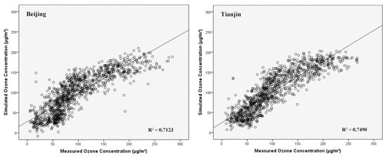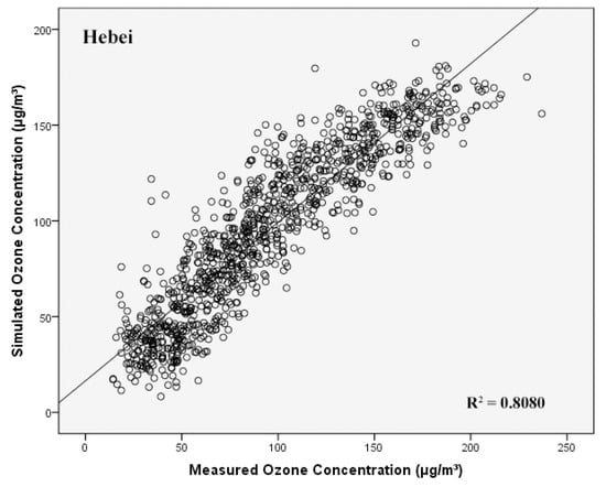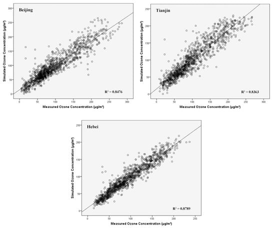 The performance of the SR model in Beijing, Tianjin and Hebei province is shown in Table 4. The averaged adjusted R2, RMSE and MAE values were 0.7564, 26.82 and 20.72, respectively. The performance of the SR model for the 11 cities in Hebei province is shown in Table S1 in the Supplementary Materials.