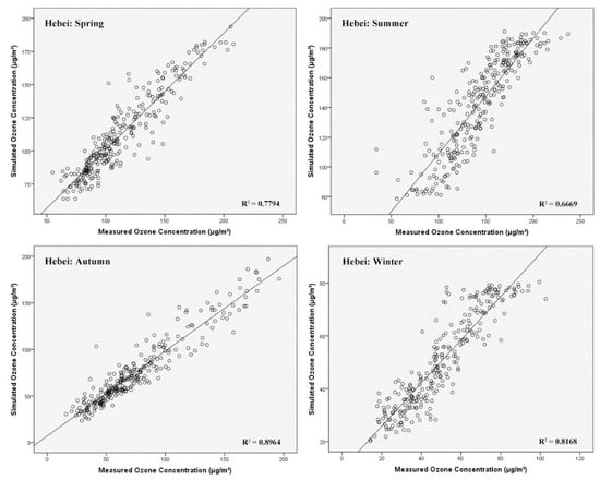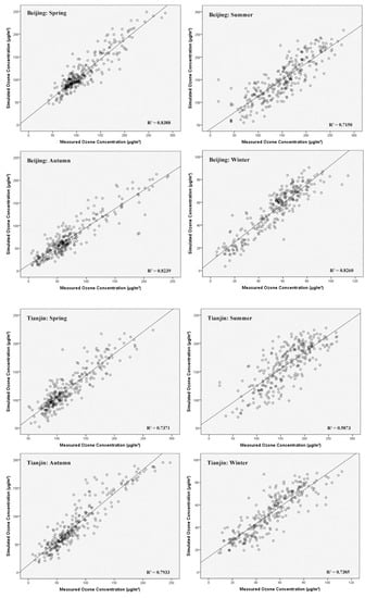 Relationship between the monitored and simulated values of O3_8h based on the neural network model in each season in Jing-Jin-Ji region in China.