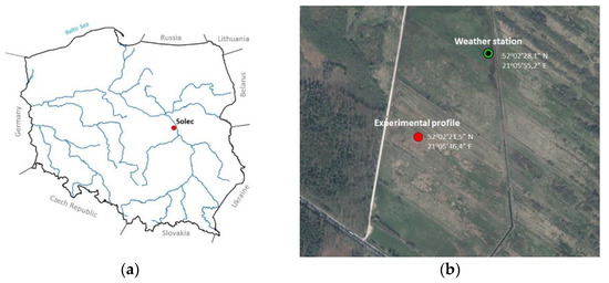 (a) Location of the Solec site within the territory of Poland; (b) the experimental profile and the weather station.
