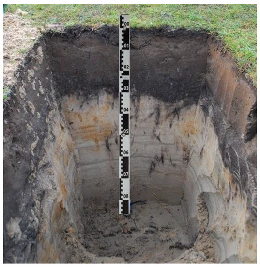The presented data prove the highest variability of the properties for the topsoil layers, which are characterised by the lowest bulk density and the highest porosity and organic matter content, in comparison to deeper layers. Deeper layers (below 25 cm) were mainly dominated by the occurrence of the specific sand formation, the so-called Vistula sand. The whole soil profile was classified as a gley soil, Stagnic Folic Gleysols–Arenic, according to WRB [13].