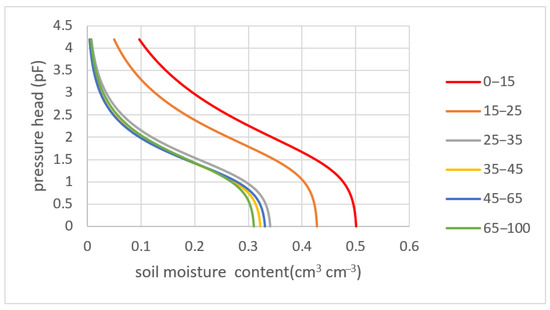 Below the depth of 25 cm, the pF curves were similar and the main differences only appeared in the saturated moisture content of the selected layers. This part of the soil profile included only the sand formation with a slightly different bulk density and organic matter content. The top layers are also basically formed from sand materialhowever, they were differentiated by soil bulk density and organic matter content. This is especially visible in the saturated moisture content. In the layer 0–15 cm, this parameter value was approximately equal to 50%.