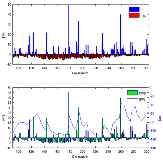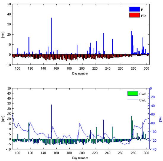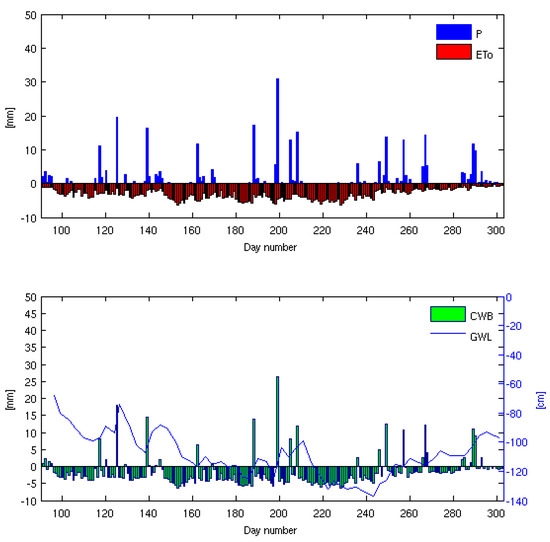 In the case of 2016, the period from approximately the 152th to the 210th day was characterized by the lowest climatic water balance values (−3.6 mm) corresponding with the lowest ground water table depth, equal to 108 cm. In a later part of the observation period, the climatic water balance reached slightly higher values, approaching positive ones around the 275th day (last days of October, Figure 5). However, in 2017, the lowest climatic water balance values were approximately equal to −3.5 mm from the 144th to the 177 day, when the ground water table reached about 104 cm in depth (Figure 6). In the case of the dry years of 2015–2016, insignificant precipitation totals caused no rapid ground water table rise (Figure 4 and Figure 5), contrary to the average year 2017 that involved a more rapid water table rise due to occurring precipitation (Figure 6).
