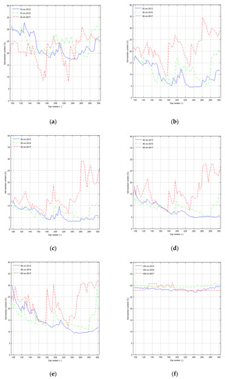 In the next stage of the analyses, the temporal courses of soil moisture were evaluated (Figure 7a–f). Throughout the observation period of 2015–2016, at a depth of 10 cm, the soil moisture content values reached a similar level. At the beginning of that period, from the 90th day (1 April) to about the 150th day (30 May), the soil moisture gradually decreased from 32% to around 10%, and afterward remained at that level for 30 days (between the 150th and 180th day). Then, owing to the occurrence of precipitation, the soil moisture content values increased during both measurement periods, that is, for 2015 and 2016.