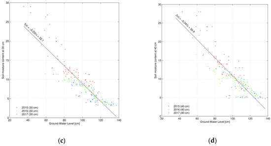 The elaborated soil moisture content measurements at consecutive depths (10, 20, 30 and 40 cm) along with the ground water table observations facilitated in establishing relationships between those parameters (Figure 8a–d). Taking into account the relationship established for the depth of 10 cm (Figure 8a) for the years 2015–2016, the range of moisture content and ground water table changes was nearly identical. In the case of 2017, considerably higher precipitation (Table 2) but similar ground water table depths generated substantially lower (by around 10%) moisture contents at that depth as compared to previous years. In the case of other analysed depths (20, 30 and 40 cm, Figure 8b–d), the measurement points of 2015 and 2016 were close to one another. The data in 2017 had slightly higher values (on account of the diverse meteorological conditions); nonetheless, they fit in the previous linear trend of established relationships. The advantage of the obtained linear equations is the feasibility to describe average and wet soil water conditions.