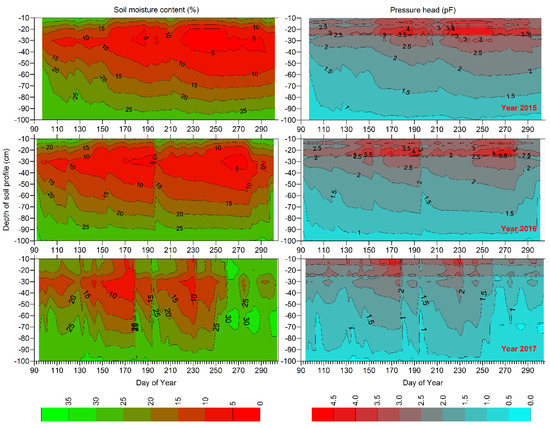Soil water content distribution for the vegetation seasons of 2015 and 2016 clearly indicates the zone of the lowered content values, ranging from 5% to about 15% in the layers from 15 to 45 cm below ground. However, pF values ranging from 3.5 to 4.0 were noted for 2015 and 2016 in the layers from 10 to 25 cm, which seems to indicate the beginning of a drought, but involves different layers than indicated by soil water content. In 2015, the increased potential values occurred from the 160th day onward while in 2016, from the 130th day, and they were related with soil moisture content ranging from about 10% to 15% in the layers from 15 to 45 cm in that year. In 2017, due to increased precipitation (wet year), the layer from 20 to 50 cm only periodically exhibited a soil water content lowered to 10–15%. The pF values of the layer 10–25 cm (in comparison to the previous years) were considerably lower (pF range from 2.5 to 3.0 instead of from 3.5 to 4.0). This seems to prove that the available water content persisted, contrary to 2015 and 2016, which exhibited restricted water availability to plants.