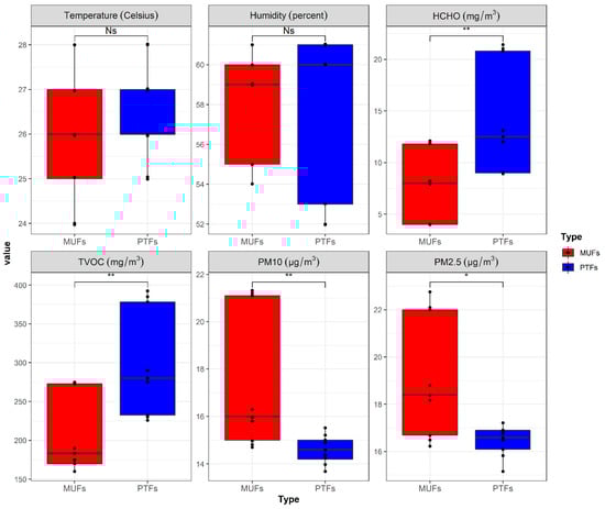 Data on six indoor air environmental parameters were collected in this study, as shown in Figure 1. Overall, the PM10 and PM2.5 concentrations in the MUF samples were significantly (1.3–1.5 times) higher than in the PTF samples (p < 0.05), whereas HCHO and TVOC concentrations were significantly (1.6–2.3 times) higher in the PTF samples than in the MUF samples (p < 0.05). The temperature and humidity (regarded as critical indoor quality parameters) were not significantly different from the other air parameters (p > 0.05). Moreover, the temperatures in the MUF and PTF samples were not significantly different, as the temperatures of the locations where the samples were collected are currently regulated to 24–27 °C by the Ministry of Environment, South Korea.
