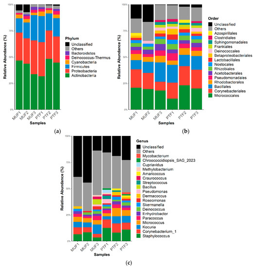 Bacterial relative abundance (%) at the (a) phylum, (b) order, and (c) genus levels in MUF and PTF samples. The data are reported as relative abundances (%) of taxa with abundances of ≥1%.