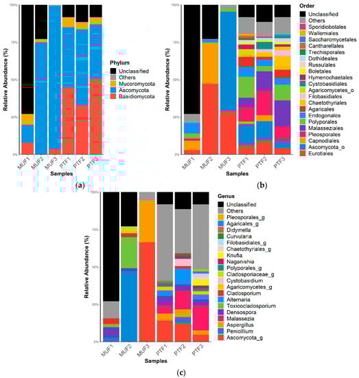 Fungal relative abundance (%) at the (a) phylum, (b) order, and (c) genus levels in MUF and PTF samples. The data are reported as relative abundances (%) of taxa with abundances of ≥1%.