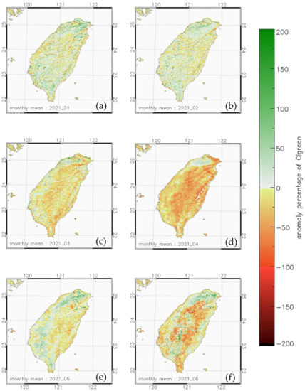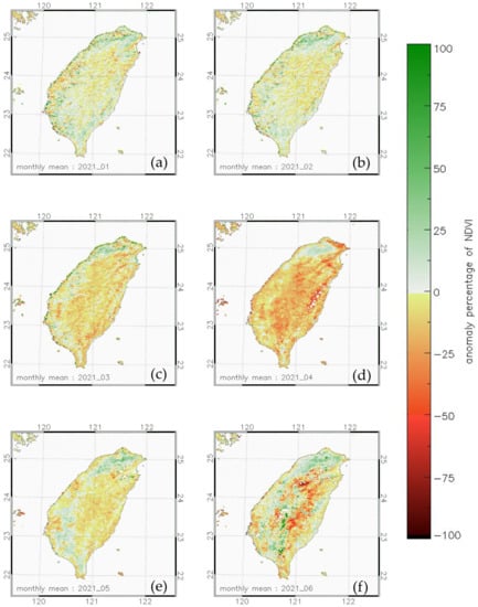 The anomaly of percentage of NDVI over Taiwan from January to June 2021 (from (a–f)). Color scale is shown at the right.