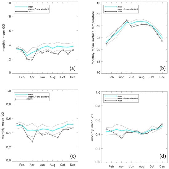The time series of monthly mean indices and variables stepping through the 12-month annual cycle (January to December, as marked on the abscissa). For each index, the blue line and the accompanying pair of gray lines are the mean and +/− one standard deviation derived from the data for 2016–2021. The black line is the value of the index for 2021. (a) CIgreen; (b) surface temperature; (c) VCI; (d) VHI.