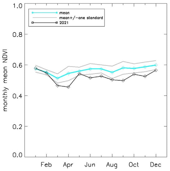 In Figure 6b–d, we further show the 12-month evolution of (b) surface temperature, (c) vegetation condition index (VCI) and (d) the vegetation health index (VHI). In spring 2021, surface temperature was generally above normal which was a favorable condition for drought. The evolution of VCI in Figure 6c is similar to that of CIgreen in Figure 6a, as the former is derived from the latter. The VHI shown in Figure 6d combines the indices of surface temperature (TCI in Equation (6)) and vegetation (VCI). It also shows a negative anomaly through spring in 2021. Note that the range of plus/minus one standard deviation for this index is relatively large in spring, implying a higher risk for droughts to occur in this season. In contrast, the standard deviation is small in summer, implying a less volatile condition for the occurrence of droughts in the warm season. Since VCI and VHI depend on CIgreen, which is in turn computed from NDVI, we show the area-averaged time series of NDVI Figure 7. With the occurrence of a significantly negative anomaly in spring 2021, the behavior of NDVI is broadly similar to VCI or VHI. All three indices are potentially useful for monitoring drought. The particular choice might depend on applications. (For example, VHI includes the information on surface temperature and might be a sharper indicator for a hypothetical drought that is caused by severely elevated temperature).