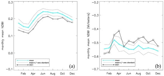 While the vegetation indices represent an important aspect of the drought, particularly its agricultural impacts, for the purpose of early warning, it is known that negative anomalies in water indices emerge even before the decline in vegetation indices []. To supplement the vegetation indices, we further show the time evolution of NDWI in Figure 8, using the same format as Figure 6 and Figure 7. Figure 8a is for the version of NDWI defined in []. It shows a negative anomaly (at one standard deviation below normal) in wetness starting from January 2021. In this context, this index potentially provides a sharper indication of early warning of drought compared to the vegetation indices. On the other hand, after January–February, the negative anomaly in NDWI stays at about the same level through the rest of the year. It does not show a steep decline in March as do the vegetation indices. Thus, the vegetation indices provide a better representation of the rapid intensification of drought leading to its peak in April. The insight here is that different indices reflect different aspects of the drought. We may obtain a more complete picture of a drought event by combining a hybrid set of those indices together.