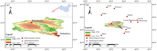 The topography and river network in the upper reaches of the Kaidu River basin (a); the stations in and around the basin (b).