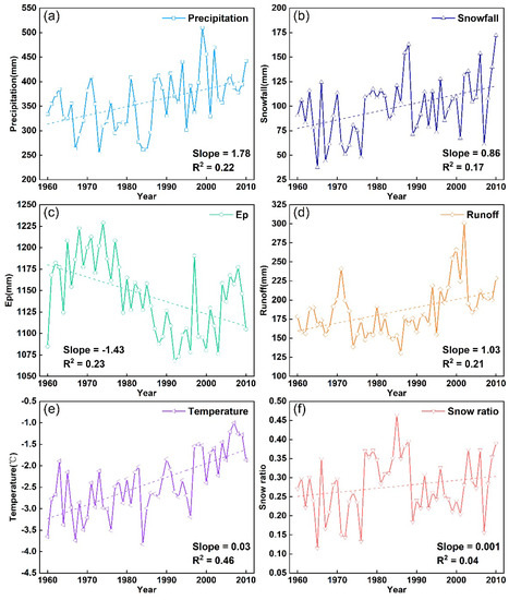 We firstly analyzed the trends in different climate factors, which helped us better understand their impacts on runoff. Figure 2 displays the long-term trends in annual precipitation, snowfall, EP, and runoff from 1960 to 2010. The annual precipitation, runoff, and average air temperature all showed a significant increasing trend, and the trend in annual precipitation was more obvious during the period of 1990–2010. The average values of annual precipitation, runoff, and air temperature were 358.1 mm, 185.4 mm, and −2.43 °C, with an increase of 17.8 mm, 10.3 mm, and 0.03 °C per decade, respectively. EP had a significant decreasing trend, and it declined by 16.6 mm every decade, and the average EP from 1960 to 2010 was 1144.2 mm. The average annual snowfall was 99 mm during the period of 1960–2010, with a variation of 8.6 mm per decade. The snow ratio in the period of 1960–2010 also increased.