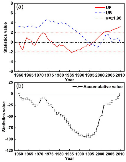If UFn is larger than the critical value of 1.96 (or lower than −1.96), the trend of the variable in the whole study period is considered to be significant at a 5% significance level. We can put the time series in reverse order and use Equations (4)–(8) to calculate a new statistic UBk. At a 5% significance level, if UFk is outside the range of critical values (α = ±1.96), the increasing trend (UFk > 0) or decreasing trend (UFk < 0) will be significant. The intersection of UBk and UFk is the abrupt point in the time series. Accumulative anomalies were also used to validate the result of the Mann-Kendall nonparametric test.
