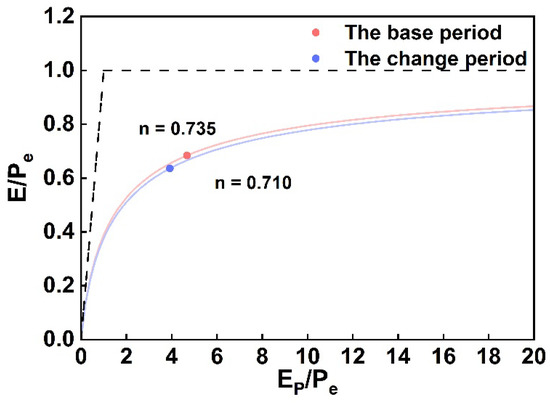 We also display the data in the two periods in the Budyko space. As shown in Figure 4, the data points in the base period and change period were in different Budyko curves. Compared with the base period, the dryness index (EP/P) in the change period decreased significantly, indicating a tendency for a warmer and wetter climate in the upper Kaidu River basin.