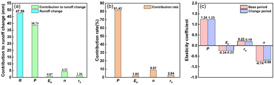Figure 5c displays the effect of proportional changes in precipitation, snow ratio, EP, and parameter n on runoff change. During the base period, an increase of 1% in precipitation and snow ratio increased the runoff by 1.24% and 0.22%, respectively. In contrast, an increase of 1% in EP and parameter n reduced the runoff by 0.24% and 0.74%, respectively. During the change period, an increase of 1% in precipitation and snow ratio increased the runoff by 1.23% and 0.19%, respectively, and an increase of 1% in EP and parameter n, in contrast, reduced the runoff by 0.23% and 0.69%, respectively. The elasticity coefficient of runoff to precipitation was the largest among all the elasticity coefficients, and the parameter n had the second largest elasticity coefficient. Compared with the elasticity coefficients in the base period, the elasticity coefficients of runoff to precipitation, EP, rs, and parameter n in the change period were reduced by 0.81%, 4.17%, 13.64%, and 6.76%, respectively. This result indicates that the elasticity coefficient of runoff to precipitation did not change significantly in the two periods.