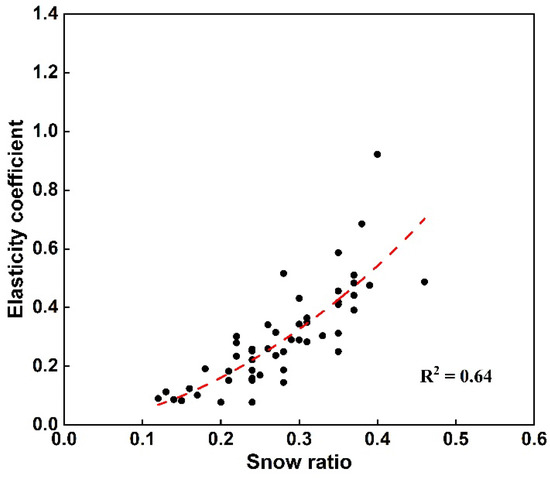 Figure 7 shows that the snow ratio elasticity coefficient of runoff has a positive correlation with the snow ratio. A larger snow ratio corresponded to a larger runoff elasticity coefficient. In the wet years, with a high snow ratio, the basin would get more runoff than the basin with a low snow ratio when the snow ratio increased. In dry years, the runoff loss of the basin with a low snow ratio would be less than that with a high snow ratio when the snow ratio decreased. Liu et al. [31] raised a hypothesis that a higher snow ratio might lead to annual streamflow increases in the wet year and decreases in the dry year. The snow ratio elasticity coefficient of runoff in the upper reaches of the Kaidu River basin might partially prove this hypothesis. However, the correlation between precipitation and snow ratio was still not fully clear and needed further study.