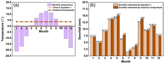 Han et al. [54] collected the air temperature and precipitation type data from 643 meteorological stations in China from 1961 to 1979 and summarized the critical temperature for distinguishing rainfall and snowfall in the whole country. The result showed that the critical temperature of rainfall and snowfall in northwestern China was about 3.70 °C (empirical temperature). Since we combined the amount of snowfall and sleet, the temperature that distinguished the precipitation types using Tw was equal to the Tmax in Equation (1) in this study. Then, we summarized the monthly average Tmax. Figure 8a indicates that the Tmax was smaller than the empirical temperature in all months.