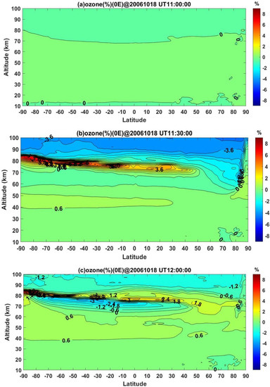Figure 4a shows that the deviation of ozone in the middle atmosphere is approximately 0 at all latitudes before the start of the flare, which means the flare case is the same as the baseline case before the start of the flare. Figure 4b demonstrates the situation after 30 min of flare at 11:30:00 UT; the figure shows that, in the stratosphere, there is an 0.6% increase in ozone at 40–50 km in the low latitudes in the Northern Hemisphere, and the ozone response of the overall Southern Hemisphere increases by 0.6% at the same altitudes. O3 in the upper stratosphere extends from the tropical high-value center to the Arctic (Antarctic) as a result of large-scale air movements such as Brewer–Dobson circulation [34], which forces the stratospheric ozone from the tropics to the polar regions. The ozone layer can absorb most of the UV rays (mainly wavelength at 200–320 nm). The ozone generation reaction and the reaction rate increase by the largest magnitude compared with other ozone-depleting reactions when the solar UV radiation is enhanced, resulting in an overall ozone increase in the stratosphere. In the mesosphere, there is a positive response of up to 6% at 70–85 km, except in high latitudes in the Northern Hemisphere. In the low thermosphere, there is a −3.6% response above 85 km in all latitudes. At 70–85 km, there is insufficient HOx production to overcome increased Lyman-α photodissociation of molecular oxygen (odd hydrogen still plays a role in determining the ozone density to about 82 km). Thus, at 85 km, where increased net production of odd oxygen maximizes, there is a peak in the ozone response.