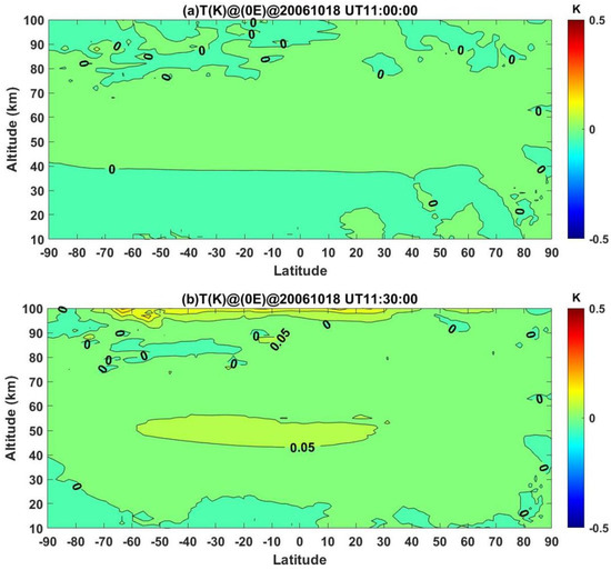 Figure 5a shows the deviation of temperature in the middle atmosphere is approximately 0 at all latitudes at the start of the flare, and it is convincing, which means the flare case is the same as the baseline case before the start of the flare. Figure 5b demonstrates the situation 30 min after the start of the flare at 11:30:00 UT; the figure shows there is an 0.05 K increase in temperature at 40–50 km in the stratosphere in the low latitudes of the Southern Hemisphere and Northern Hemisphere, while in the middle latitudes, the increase in temperature is in the Southern Hemisphere. In the mesosphere, there is also an 0.05 K increase in temperature at 80–90 km in low latitudes of the Southern Hemisphere. In the low thermosphere, there is also an increase in temperature in the low and middle latitudes larger than in the middle atmosphere. Solar flares produce large and rapid increases of solar X-ray and extreme ultraviolet (EUV) radiation. These rapid increases directly enhance ionization in the upper atmosphere, causing “sudden ionospheric disturbances” (SID) [35]. These temperature differences, which are caused by the heating of the thermosphere due to enhanced ionization, are altitude-dependent.