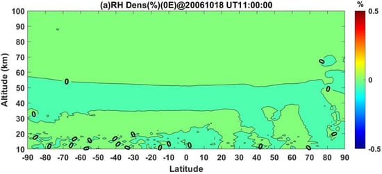 Figure 6a shows the deviation of relative atmospheric density in the middle atmosphere is approximately 0 at all latitudes at the start of the flare, and it is convincing, which means the flare case is the same as the baseline case before the start of the flare. Figure 6b demonstrates the situation 30 min after the start of the flare, at 11:30:00 UT; the figure shows there is an 0.05% increase in relative atmospheric density in the low latitudes of the Southern Hemisphere and Northern Hemisphere, while there is an 0.1% increase in relative atmospheric density in the Southern Hemisphere in the middle latitudes. In the mesosphere, there is also an 0.05% increase at 80–90 km in low latitudes of the Southern Hemisphere.