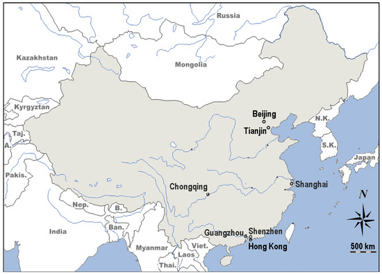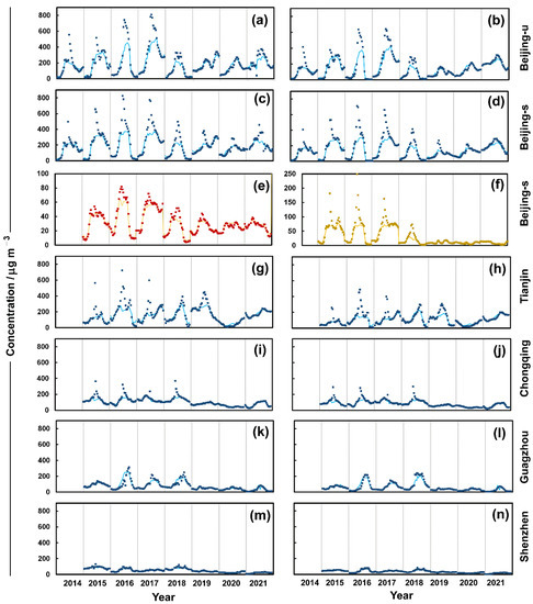 Hourly measurements of six pollutants (PM10, PM2.5, CO, NO2, O3, and SO2) have been available from air quality monitoring stations in each of the cities for almost a decade. This study focused on particulate matter (PM10 and PM2.5) as these concentrations illustrate the clearest signature of the Chinese New Year firework events [17]. Beijing has data from 12 monitoring stations in the central urban area and 11 stations beyond the 5th Ring Road (http://aqicn.org/city/ accessed on 29 August 2022), although there are gaps in some years. In Tianjin, Chongqing, Guangzhou, and Shenzhen, data was taken from 8, 12, 10, and 11 sites, respectively. On occasions, we referred to specific sites in Tianjin and Chongqing and used their official site code in Tianjin: 1015A, 1017A, 1018A, 1019A, 1021A, 1023A, 1024A, and 1026A; and in Chongqing: 1416A, 1417A, 1418A, 1419A, 1420A, 1421A, 1422A, 1425A, 1426A, 1427A, 1428A, and 1429A. The average concentration over all stations was used to represent the overall concentration in the cities.