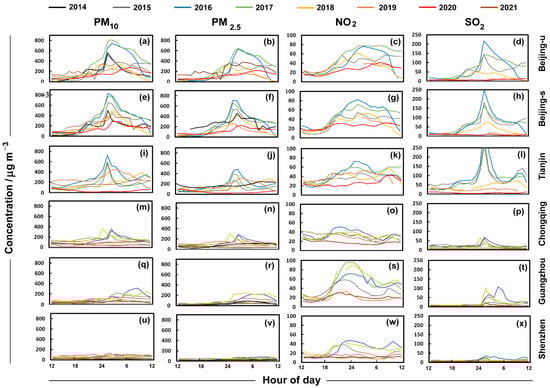 Concentrations of PM10, PM2.5, NO2, and SO2 for Beijing-u (a–d) and Beijing-s (e–h), which are the more urban and suburban parts within and beyond the 5th Ring Road, Tianjin (i–l), Chongqing (m–p), Guangzhou (q–t), and Shenzhen (u–x) from midday on New Year’s Eve to the middle of the first day of the new year from 2014 to 2021. Note: 2014 and 2021 absent from some sites.