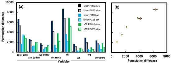 The random forest model provides estimates of the contributions from various parameters to pollutant concentrations. Figure 4a compares the importance of variables and highlights the significance of relative humidity (rh) in predicting both PM10 and PM2.5 concentrations via the random forest model for the more central Beijing urban area from 2014/2017 (allow), when fireworks were less well regulated, and the better regulated period 2018/2021 (ban). Beyond the 5th Ring Road, fireworks have typically been allowed from 2014/2021. It may seem odd that the particulate concentration was most strongly related to humidity and not wind-related parameters, but this was also found in previous studies [51,52,53]. This suggests that humidity is an important factor that influences particle loading. The presence of water vapor might also accelerate particle growth and encourage the accumulation of airborne firework particles.