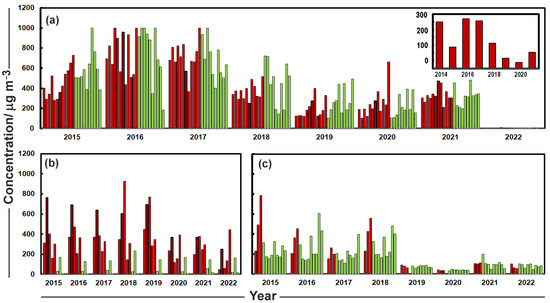 The change in particulate matter is evident in the temporal plots, so the concentrations of PM10 and PM2.5 were used here as a marker of pollution derived from fireworks. Thus, we largely restricted our study to particulate matter. Other markers, such as perchlorate and trace metals, though distinctive, were measured at few sites [17]. Peaks of PM10 and PM2.5, in urban Beijing (Figure 2a,b) were clearly observed from 2014 to 2017 at around 01:00 or 02:00 of the first day of the Chinese New Year but were less distinct after 2018. This is largely due to Beijing government’s publication of new restrictions banning residents from discharging fireworks in urban areas (within the 5th Ring Road) at the end of 2017. Figure 2e–h illustrates the changes in the concentration of air pollutants in outer areas of Beijing over the same years. The changes show a similar pattern to those in urban areas, but high concentrations of PM10 and PM2.5 were observed in all years. Nevertheless, the peak values after 2018 were lower than previously. Beijing residents were still allowed to set off fireworks in these suburban areas beyond the 5th Ring Road, so some people travelled to those locations to celebrate the important festival. However, the restrictive policy seems to have gradually changed public opinion such that the private use of fireworks has declined, resulting in lower particulate concentrations after 2018 [22]. The year 2022 revealed extremely low concentrations, as a result of not only increasing restrictions but also efforts aiming for clearer air related to preparations for the winter games that ran 4 February 2022/20 February [47,48]. There was much concern about air pollution and the interface of the games with the period of New Year celebrations [47] while COVID-19 imposed restrictions that also reduced the air pollution concentrations [48]. There were expectations of blue skies for the Winter Olympics; a concept termed “Beijing Blue” [48] has emerged to describe improved pollution during important events ever since the Olympic Games of 2008 and the APEC (Asia-Pacific Economic Cooperation) meeting of 2015 [49].