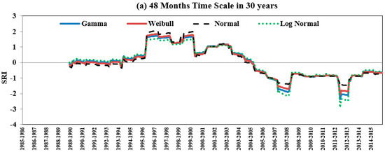 Figure 3 shows the results of drought monitoring for a 48-month time scale according to the discharge data for long (49 year) and short (30 year) time periods. Commonly, different distributions showed similar results for various time scales, such that wet and dry years were estimated more or less identically. Among all cases, under-estimation (the highest drought intensity) was related to the lognormal function and over-estimation (the maximum non-drought intensity) was related to the Normal distribution. As an example, for the 49-year record length and 48-month time scale (Figure 3a), the extreme values of SRI were −3.24 and +2.94, estimated by Lognormal and Normal distributions, respectively. Furthermore, the estimated values from of the Gamma and Weibull distributions were very similar. Similar results were obtained for other time scales of the 49-year record length as well as all time scales of the 30-year record length.