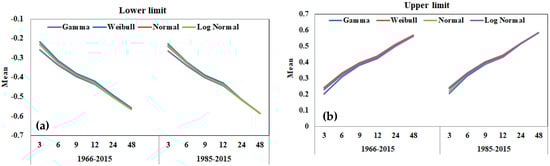 The average difference between upper and lower limits for different distribution functions and 3–48-month time scales was surveyed. As displayed in Figure 7, after an increment of time scale or record length, a reduction in uncertainty was detected. No significant difference was seen between four distribution functions. This result shows consistency with other studies in the literature [16,17,18]. Based on Vegni et al. [17], the record length is a leading source of uncertainty in SRI estimates since the mean and the standard deviation of the size of the confidence interval increase considerably passing from the 49-year to the 30-year time series. However, with the increase in the time window from short term to long term, this effect is less evident. The results of the present research also show the same truth. In fact, according to Wu et al. [10], 30 years is the minimum record length to have acceptable and reliable SPI and SRI estimates.