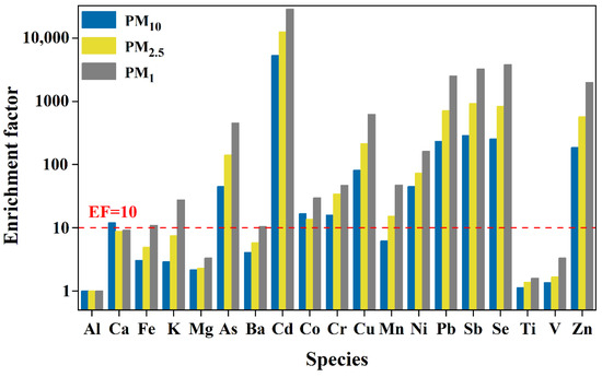 Enrichment factor (EF) of elements in PM10, PM2.5 and PM1 during 2019–2020 winter sampling campaign.