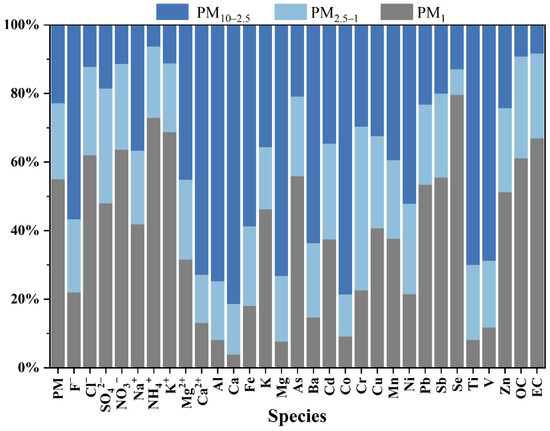 The fourth factor was identified as dust featured with abundant concentrations of Ca2+, Mg2+, Al, Fe, Mn, and Ti. The elements of Fe and Mn were partly derived from soil dust released by urban subways and ground vehicles as proposed in previous studies [72,73]. The chemical species Mg2+, Ca2+ can be regarded as good tracers of construction dust, soil dust and road dust according to previous studies [8]. Therefore, this source was apportioned as dust, which included soil dust, construction dust and transportation dust. The average contribution of dust to PM10 (19.1%) was higher than that in PM2.5 (3.9%) and PM1 (2.2%). These results demonstrated that fugitive dust was more likely to be enriched in course particles, which is consistent with the above discussion.