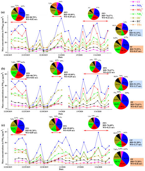 The temporal variations of chemical compositions in PM10, PM2.5, and PM1 are presented in Figure 5. The concentrations of PM represented periodic “clean–polluted–clean” cyclical patterns throughout the sampling period, which were consistent with previous studies [5,13,52,53,54]. According NAAQS (GB3095–2012), the pollution period was defined as two successive days with daily average mass concentrations of PM2.5 ≥ 75 μg m−3. During the entire observation period, three pollution periods were found on 21–25 December 2019 (PP1, 5 days), 2–4 January 2020 (PP2, 3 days), and 12–17 January 2020 (PP3, 6 days). These results illustrated that PM pollutions levels were still high though they decreased during the past several years, due to the implementation of the Clean Air Action Plan (CAAP) since 2013 [2,55].