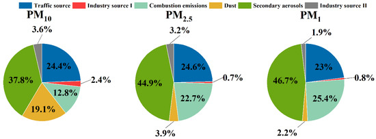 The US EPA 5.0 model was used to apportion the contribution sources of airborne particles based on the dataset of 82 effective samples from 21 December 2019 to 17 January 2020. Because the source profiles of PM10, PM2.5 and PM1 were quite similar [32,37,63,64,65], the PM data from different size particulates (PM10, PM2.5 and PM1) were combined and imputed into PMF in this study as was the case in other previous studies [38,63,64,65]. The contribution of apportioned sources calculated by evaluating the annual average concentrations are presented in Figure 6. The source apportionment results of PM are shown in Figure S3 in the Supplementary Materials. The apportioned sources and their contributions are summarized as follows: