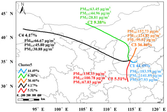 Cluster analysis of 48 h backward trajectories of PM in 2019–2020 winter.