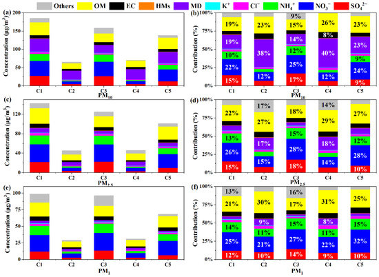 Corresponding cluster average mass concentrations and proportions of chemical compositions in PM10 (a,b), PM2.5 (c,d), and PM1 (e,f) during the observation period.