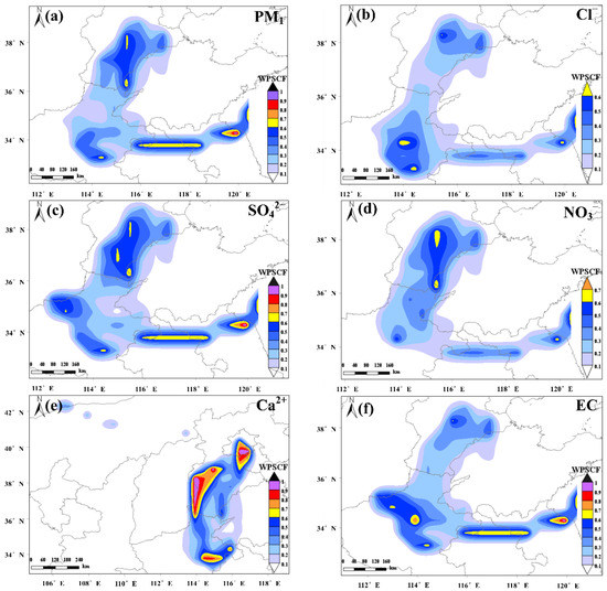 PSCF analysis for (a) PM1 and (b–f) its chemical species (Cl−, SO42−, NO3−, Ca2+, EC) in Xinxiang during the observation period. (The color bar represented the WPSCF value).